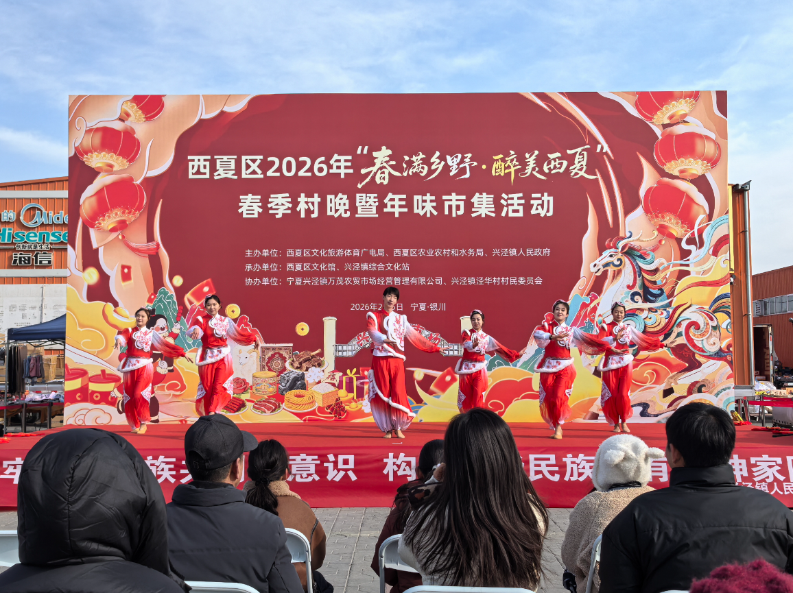 2月5日,“春满乡野?醉美西夏”西夏区2026年春季村晚暨年味市集活动在西夏区兴泾镇文化广场举行。此次活动由西夏区文化旅游体育广电局、西夏区农业农村和水务局、兴泾镇人民政府联合主办,西夏区文化馆、兴泾镇综合文化站承办,旨在为群众送上集文化、服务、互动于一体的新春盛会,为乡村振兴注入文化动能。